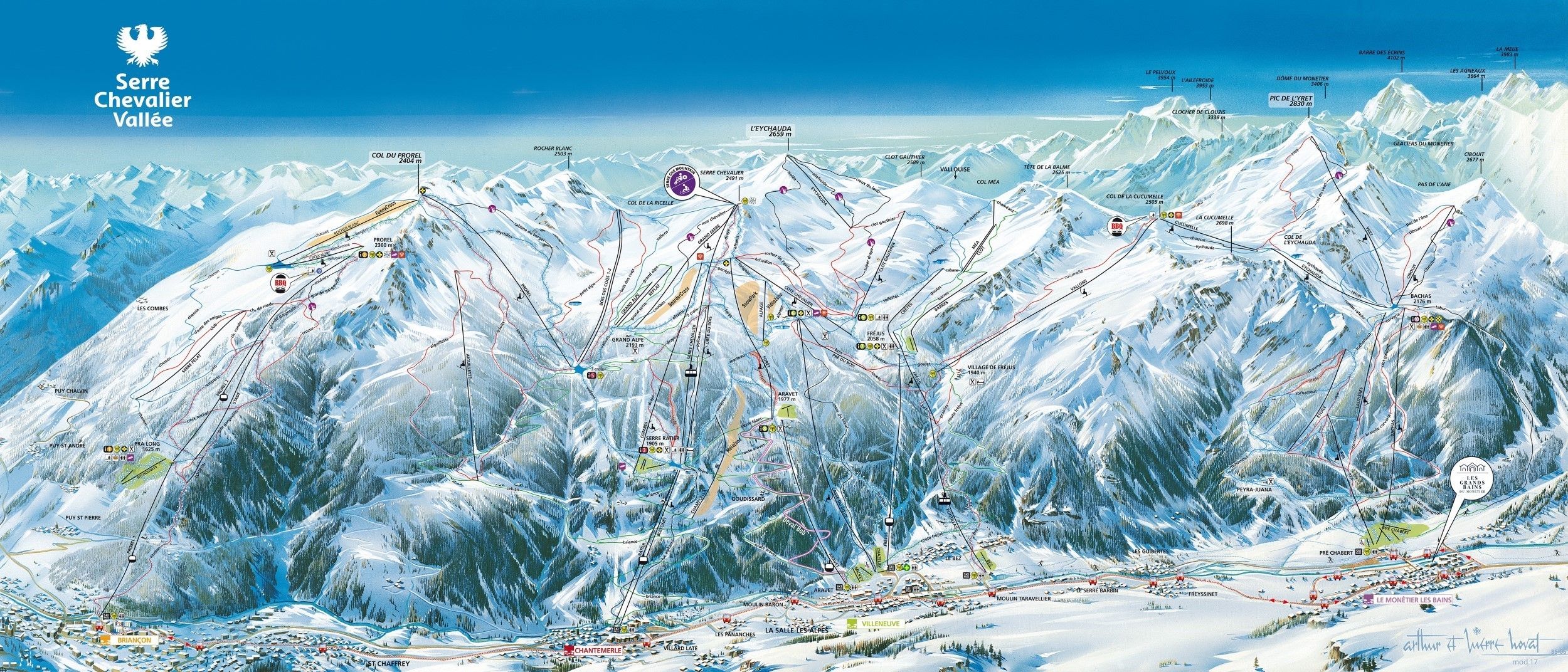 Aan de voet van de gelijknamige berg met zijn top van 2.491 m ligt de Serre Chevalier. Het skigebied in het dal van Guisane strekt zich uit over 13 dorpjes die gekarakteriseerd worden door typische stenen huisjes, middeleeuwse gebouwen en romaanse kerken. In de verschillende plaatsen treft u een combinatie aan van de gezellige sfeer die een dorp rijk is en de levendige flair van een moderne skiplaats. Serre Chevalier is met zijn 250 pistekilometer een van de grootste skigebieden van Europa - en biedt wintersporters een grote verscheidenheid aan buckelpistes en idyllische afdalingen door naaldbossen. Vooral experts kunnen zich naar hartenlust uitleven op de steile pistes, op de lange dalafdalingen en de gemarkeerde diepsneeuwafdalingen. De vier snowparks nodigen de freestylers uit hun tricks te laten zien in het gebied in het nationaal park Les Ecrins. Ook beginners vinden hier in de beginner-area geschikte pistes.Vervoer Serre Chevalier